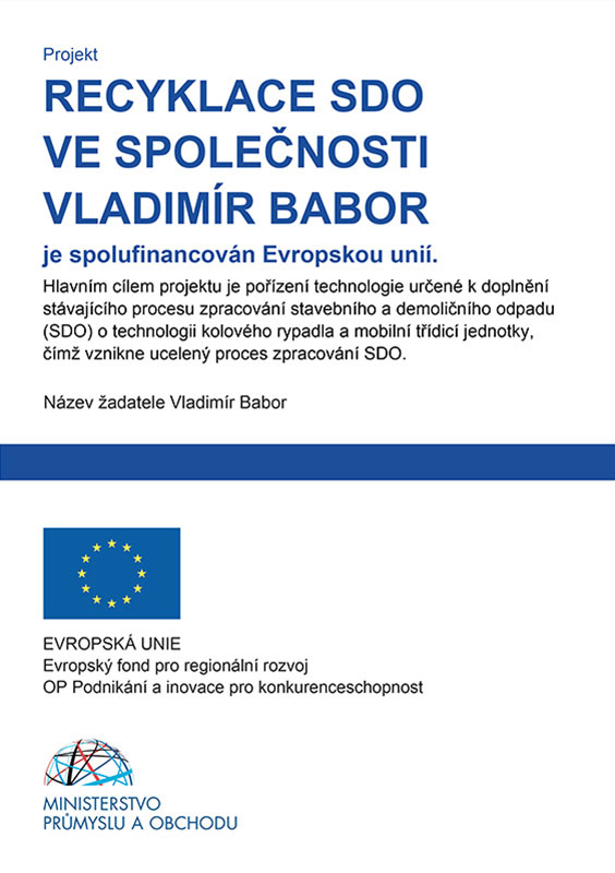 Hlavním cílem projektu tak bylo pořízení technologie určené k doplnění stávajícího procesu zpracování stavebního a demoličního dopadu (SDO). Firma před zahájením projektu disponovala pouze technologií mobilního čelisťového drtiče, který však jako samostatné zařízení má pouze velmi omezené využití, a to pro výrobu jedné netřídění frakce v rozsahu 0–110 mm dle nastavení. V rámci realizace projektu tak došlo k vhodnému doplnění této technologie o technologii kolového rypadla a mobilní třídicí jednotky, čímž vznikl ucelený proces zpracování SDO. Finální složení linky je tak následující – kolové rypadlo >> mobilní čelisťový drtič >> mobilní třídič nebo kolové rypadlo >> mobilní třídič, a to dle potřeby realizovaného procesu. Takto složená technologie není zdrojem jakéhokoliv odpadu, ale naopak je určena ke zpracování a recyklaci stavebních a demoličních odpadů (SDO), které tvoří nejvýznamnější část v produkovaných odpadech v ČR.