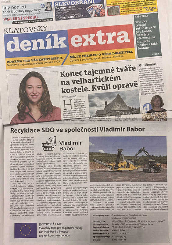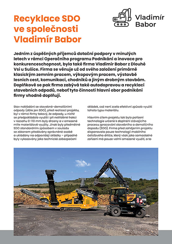 Jedním z úspěšných příjemců dotační podpory v minulých letech v rámci Operačního programu Podnikání a inovace pro konkurenceschopnost, byla také firma Vladimír Babor z Dlouhé Vsi u Sušice. Firma se věnuje už od svého založení primárně klasickým zemním pracem, výkopovým pracem, výstavbě lesních cest, komunikací, chodníků a jiným drobným stavbám. Doplňkově se pak firma zabývá také autodopravou a recyklací stavebních odpadů, neboť tyto činnosti hlavní obor podnikání firmy vhodně doplňují.